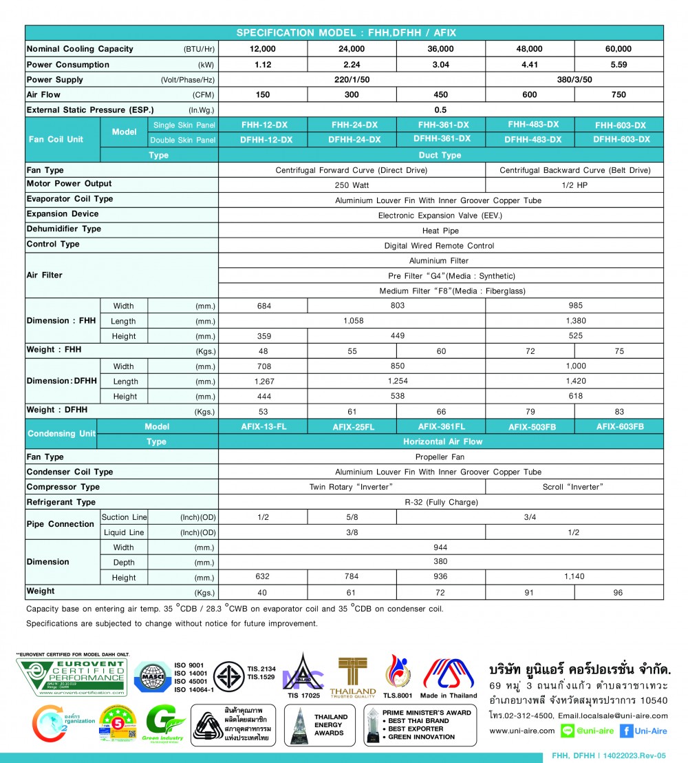 Cooling capacity 12,000 - 60,000 BTU/H
